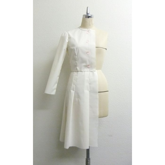 身頃のみ前明きのボタン留めの、総裏、左脇コンシールファスナー明きの仕様になっています。