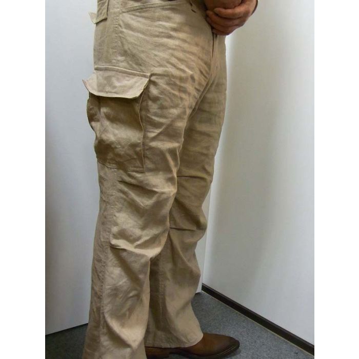 ポケットは、腰、脇、後にそれぞれ2つ、ひざにタックの入ったデザインです。脇と後ポケットのフラップは、2重になっており、内側にボタン2つがつきます。※サンプルとは異なり、後ポケットのフラップは、ポケット口の上につきます。